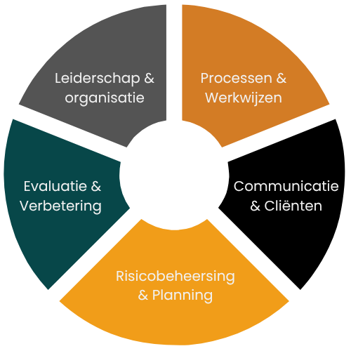- Cliëntgerichtheid & Communicatie: Staan de cliënten centraal? Wordt er geluisterd naar feedback? Is de communicatie naar cliënten en stakeholders op orde?